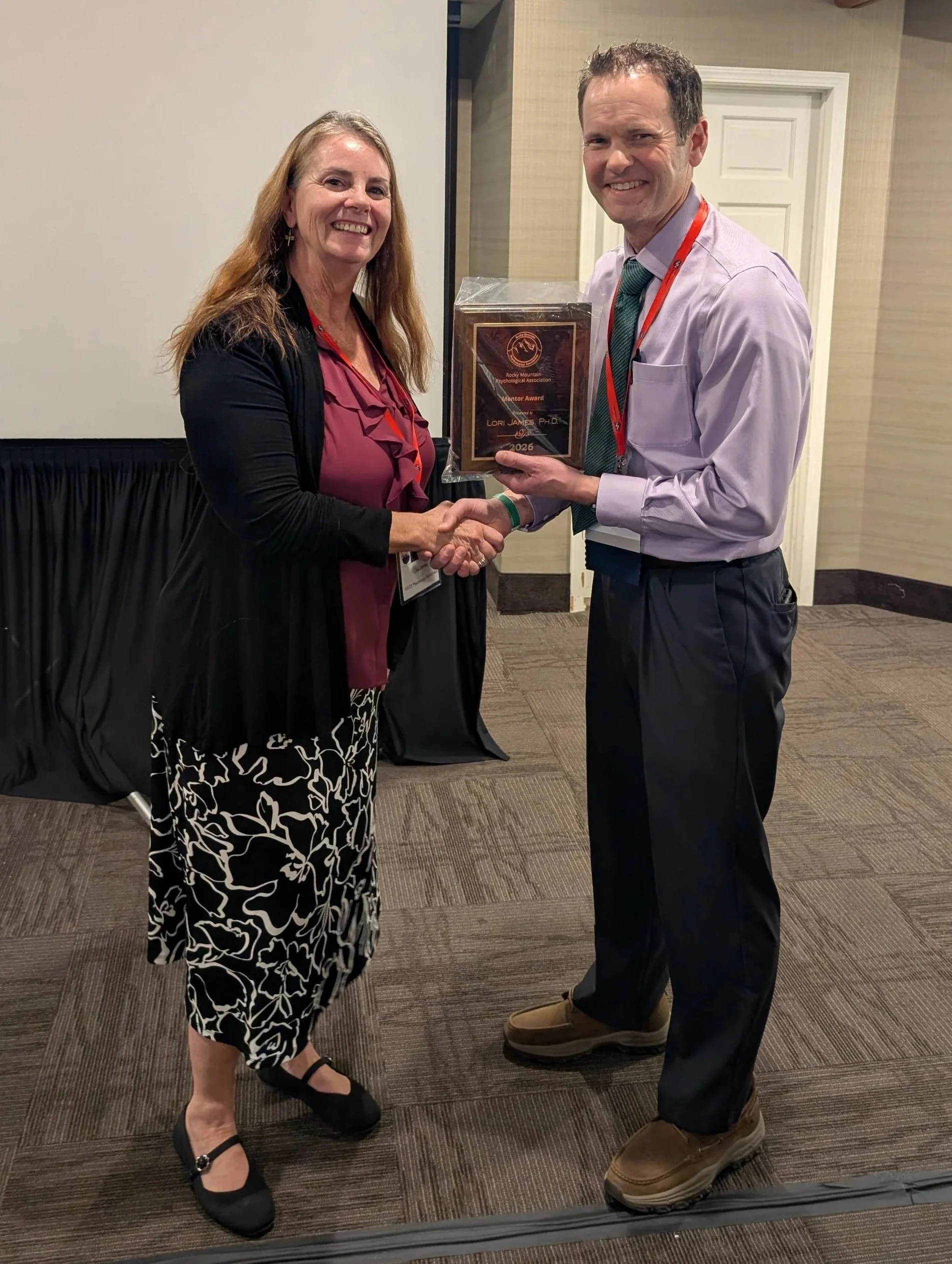 Dr. Lori James, from the University of Colorado, Colorado Springs, was given the Mentor Award by Dr. Rob Wright, RMPA’s Past President, at the 2026 RMPA Convention in Boise, Idaho.